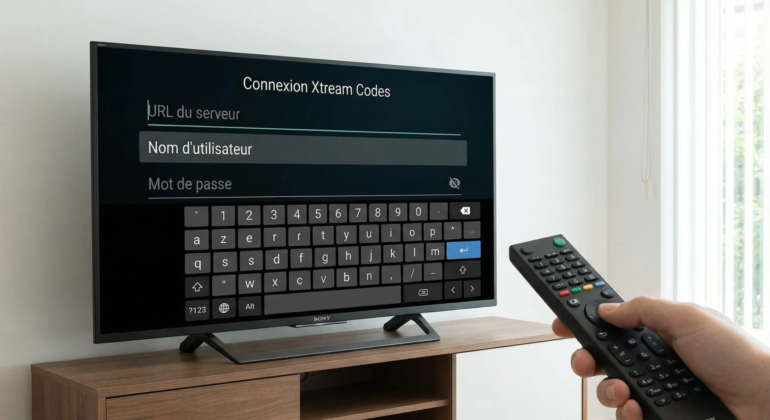 Entrez alors les trois informations fournies par votre fournisseur IPTV : l’URL du serveur (généralement sous la forme http://exemple.com:port), votre nom d’utilisateur et votre mot de passe.